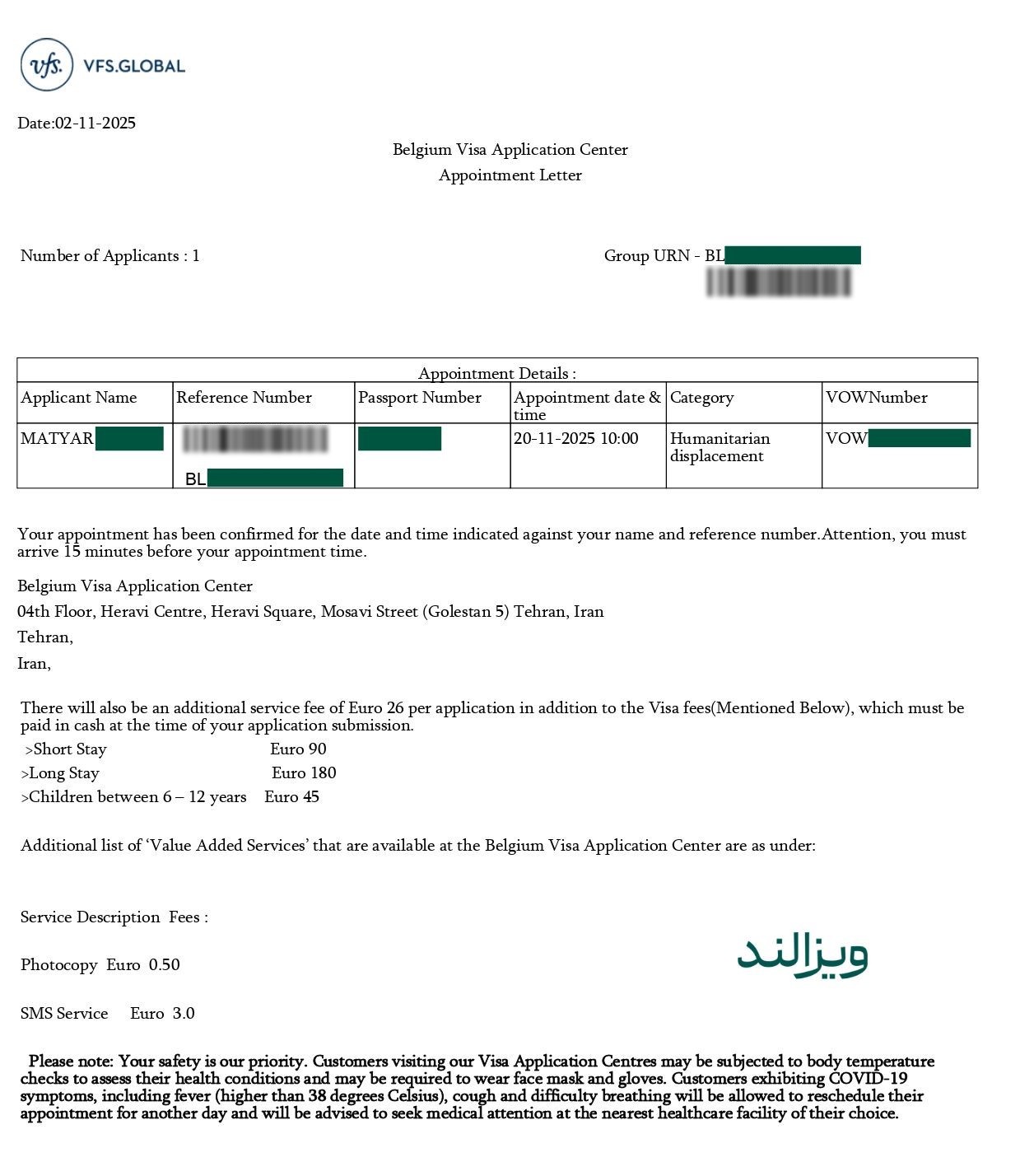 - ودیعه: پرداخت مبلغ ۱,۰۰۰,۰۰۰ تومان در سایت VFS (این مبلغ جهت اطمینان از حضور شماست و پس از مراجعه به کارگزاری، ظرف چند روز به حساب شما عودت داده میشود).