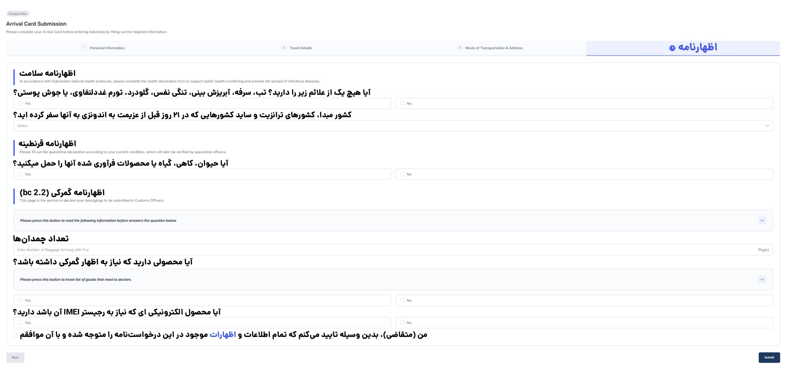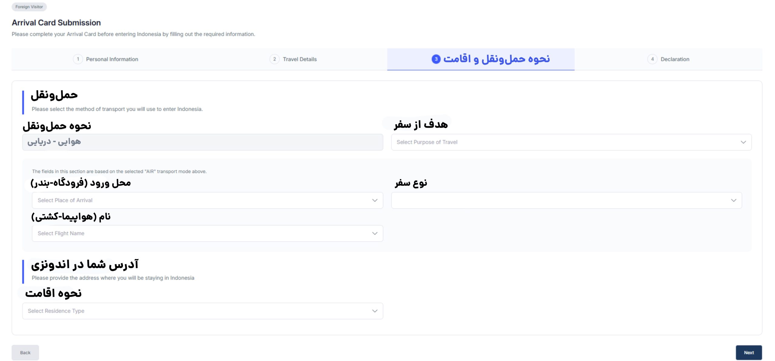فرودگاه یا بندر ورود، اطلاعات پرواز یا کشتی و آدرس محل اقامت را ثبت کنید.