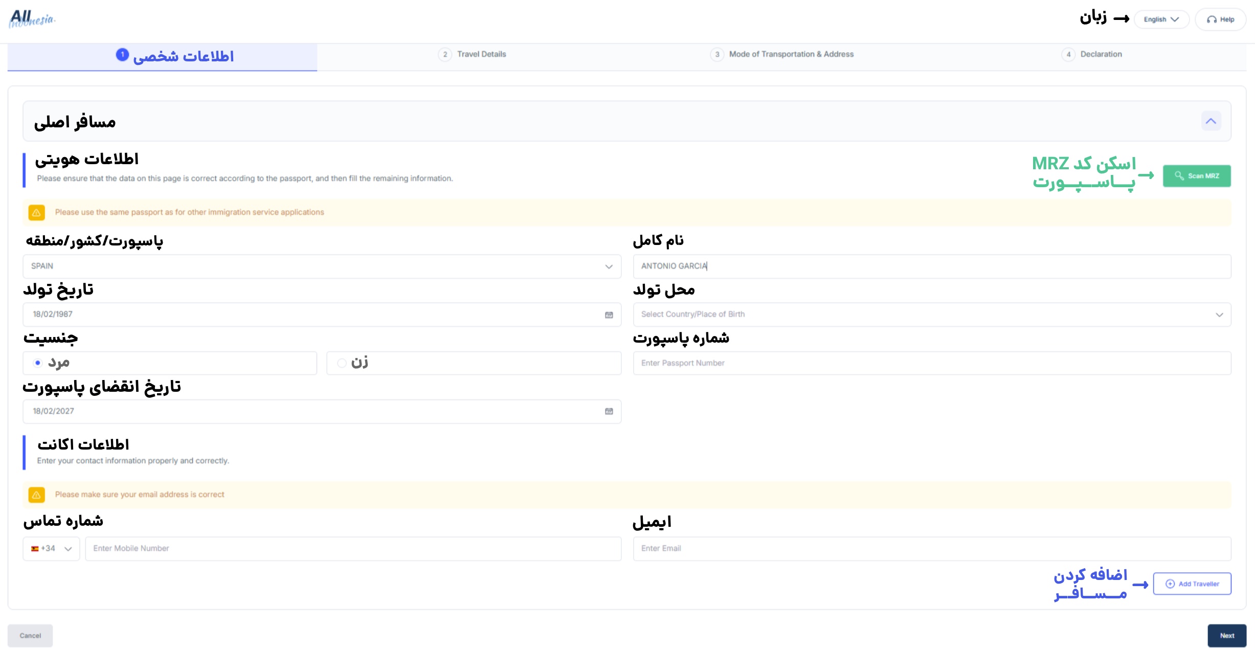 ملیت، نام، تاریخ تولد، شماره و تاریخ انقضای گذرنامه و اطلاعات تماس را وارد کنید.