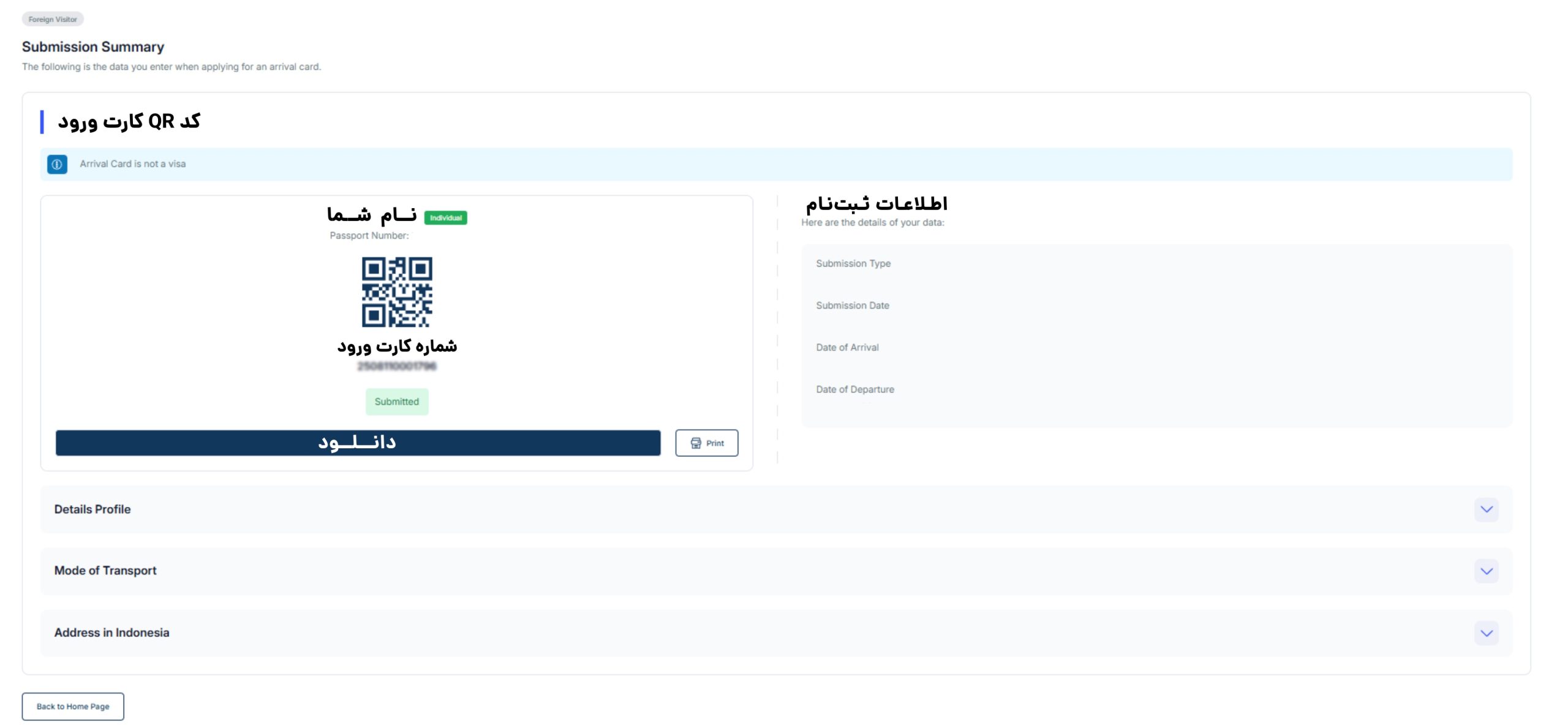 پس از ثبت فرم، سیستم به طور خودکار یک کد QR منحصر به فرد تولید کرده و آن را به آدرس ایمیل مسافر ارسال میکند. این کد باید در بدو ورود به اندونزی به مقامات مهاجرت و گمرک ارائه شود.