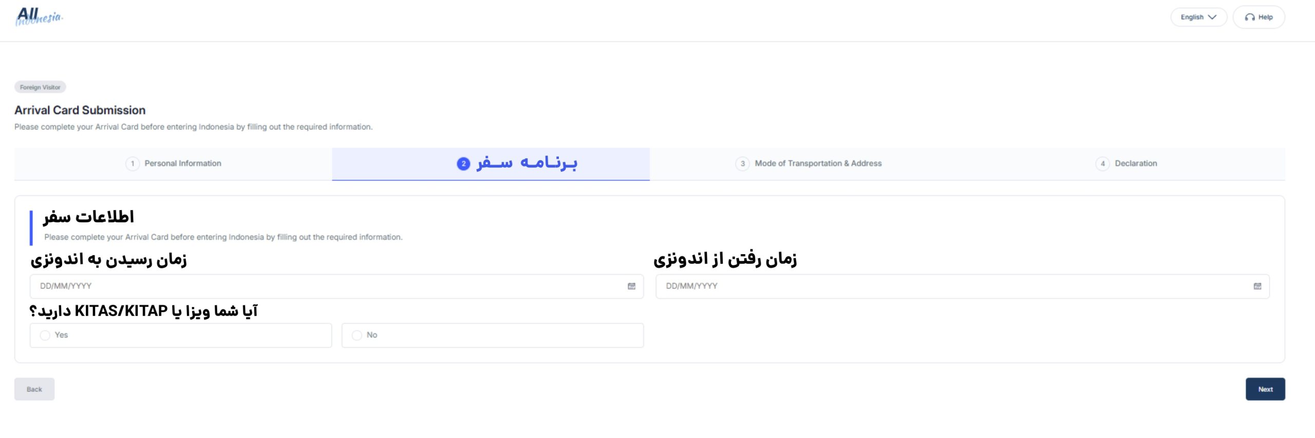 برای تکمیل فرم «All Indonesia»، مسافران واجد شرایط باید تنها از طریق وبسایت کارت ورود به اندونزی اقدام کنند. فرایند تکمیل فرم ساده است و حداکثر ۵ دقیقه طول میکشد. برای تکمیل فرم 72 ساعت تا ورود به محل بازرسی مرزی در کشور اندونزی فرصت دارید اما پیشنهاد میشود آن را پیش از رسیدن به مقصد تکمیل کنید تا در بدو ورود با مشکلی مواجه نشوید.