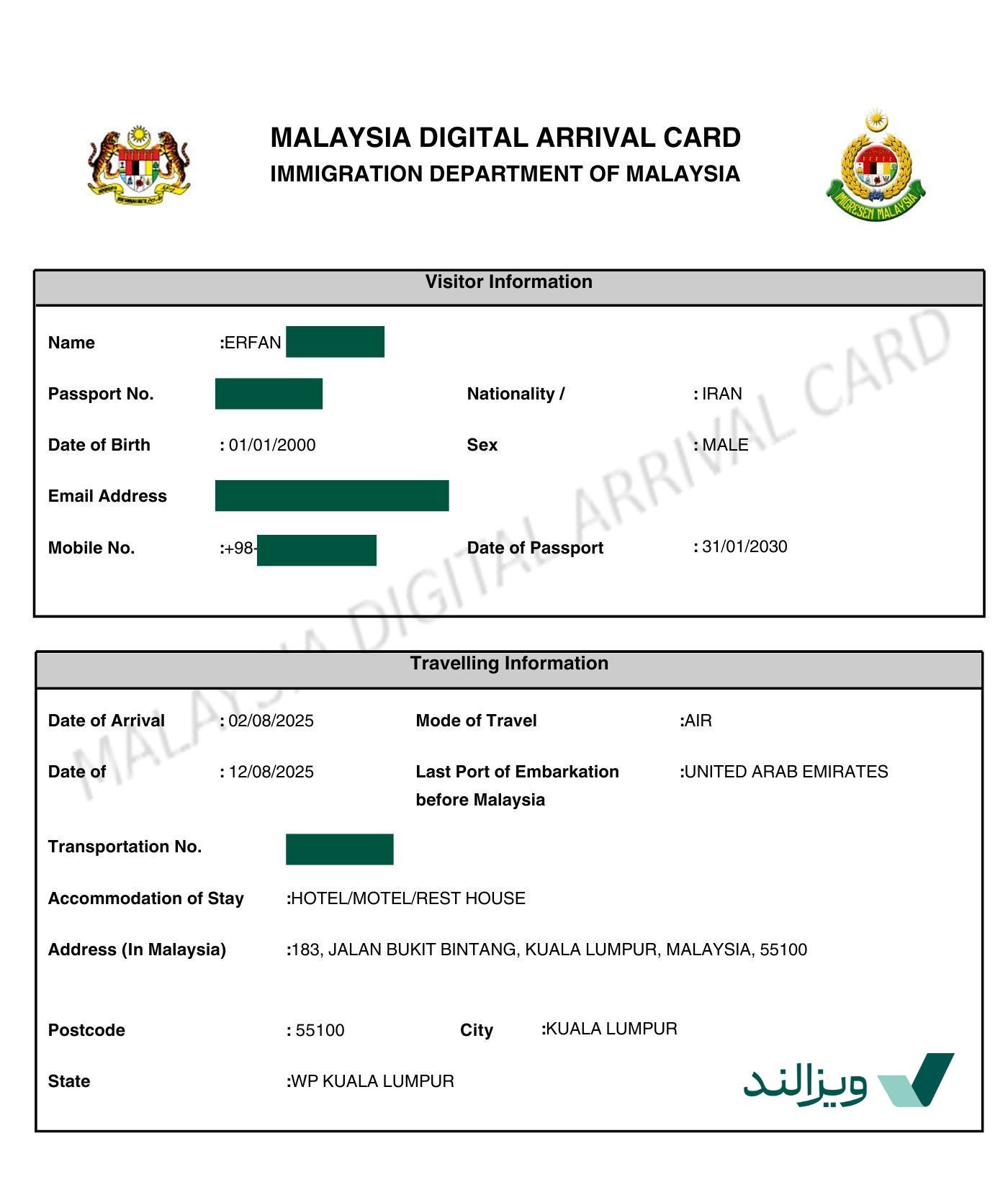 - آدرس محل اقامت در مالزی (مثلاً نام و آدرس هتل یا محل اقامت) - میتوانید کد پستی محل اقامت را نیز از طریق جستجو در گوگل پیدا کنید.