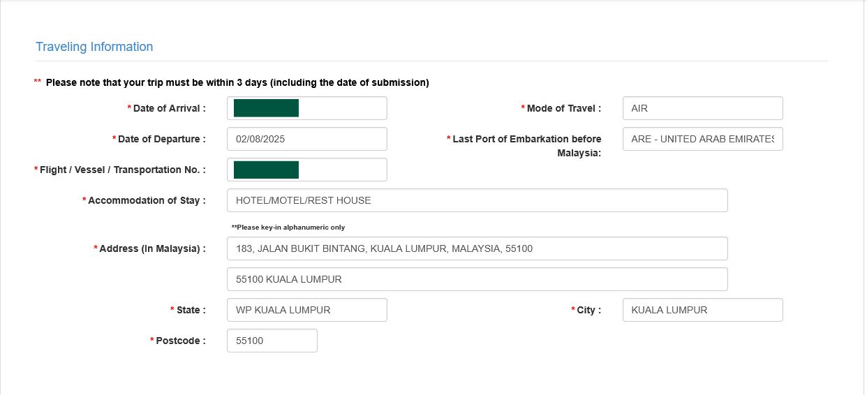 مسافران ایرانی فارغ از شیوه سفر به مالزی (بدون ویزا تا ۳۰ روز و یا با ویزا تا سقف ۶۰ روز) باید کارت ورود به مالزی را از طریق وبسایت رسمی دریافت کنند.